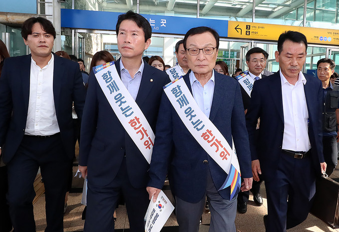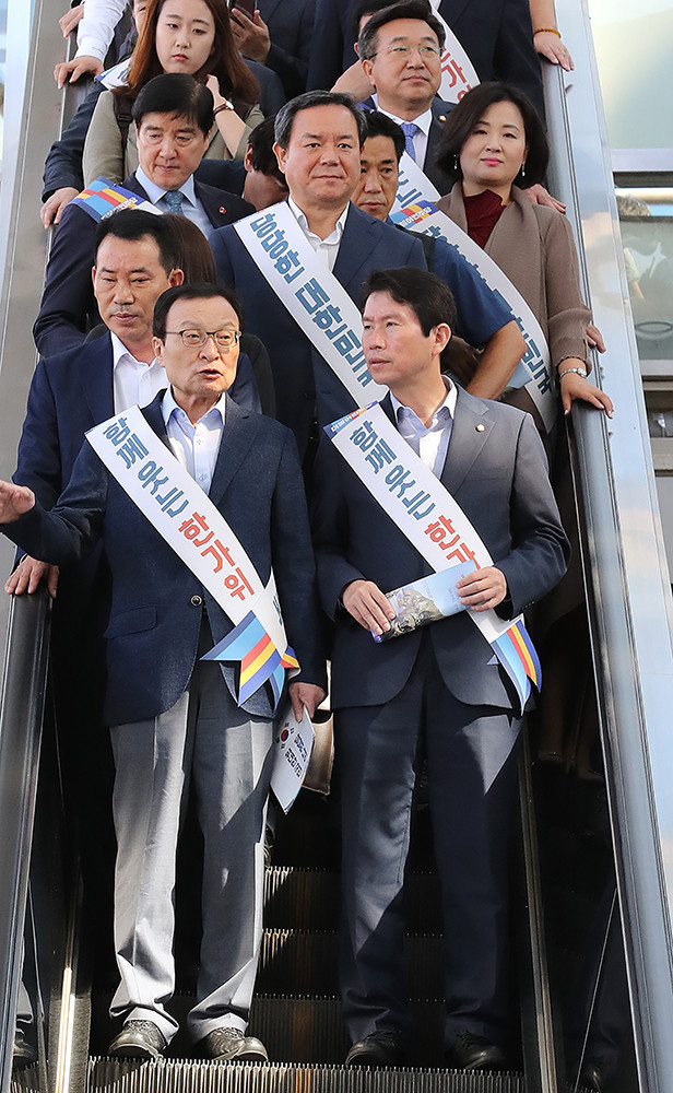 더불어민주당 이해찬 대표와 이인영 원내대표 등 의원들이 11일 오전 서울 용산구 서울역에서 추석 귀성인사를 위해 승강장으로 이동하고 있다.