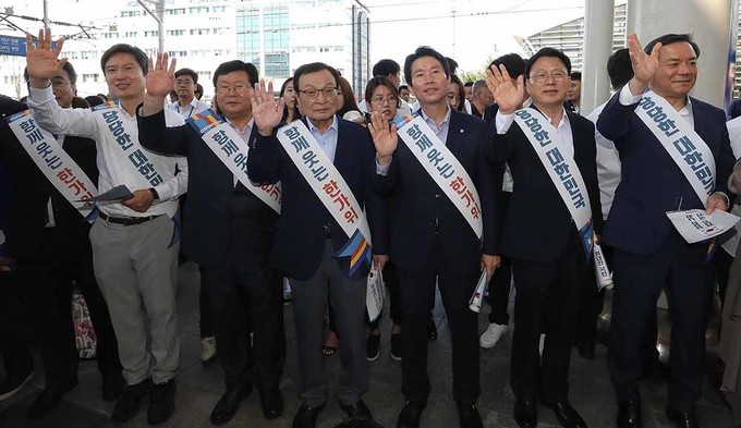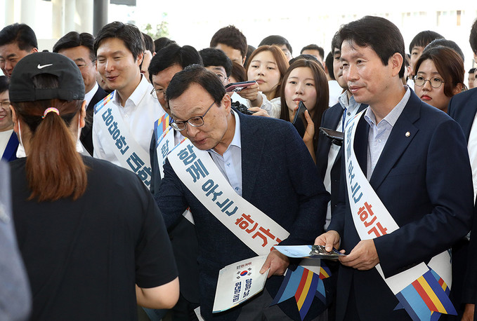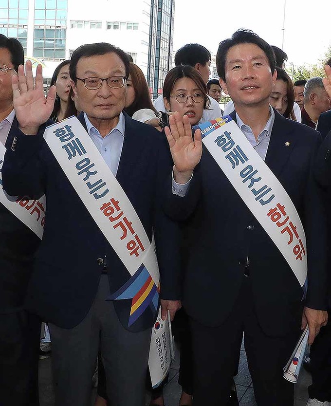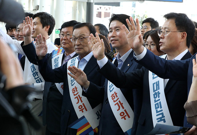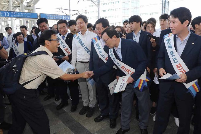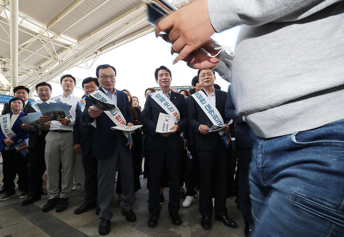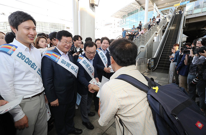 더불어민주당 이해찬 대표와 이인영 원내대표 등 의원들이 11일 오전 서울 용산구 서울역 플랫폼에서 추석 귀성인사를 하고 있다.