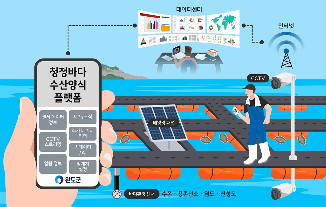 완도군은 기후변화가 가속화되면서 양식업이 직면한 수산물 폐사와 전복 가격 하락의 주된 원인으로 지목되는 '홍수 출하'를 방지하기 데이터 기반 정보통신기술 활용 '청정바다 수산양식 플랫폼'을 구축했다.