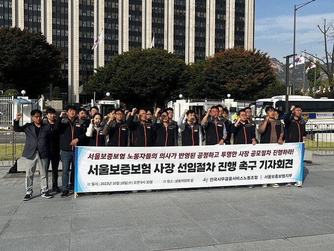 서울보증보험 노동조합은 18일 오전 정부서울청사 정문 앞에서 '서울보증보험 사장 선임 절차 진행 촉구 기자회견'을 열었다. 노조는 "유 사장 임기가 한 달 남짓 남은 현재까지 서울보증보험은 신입 사장 선임을 위한 절차를 진행하고 있지 않다"라며 "'사장후보추천위원회(사추위)'조차도 구성하지 않고 있다"고 비판했다.