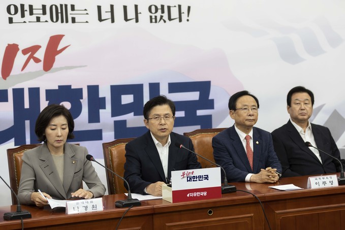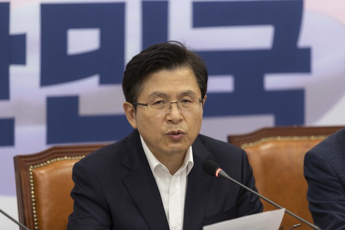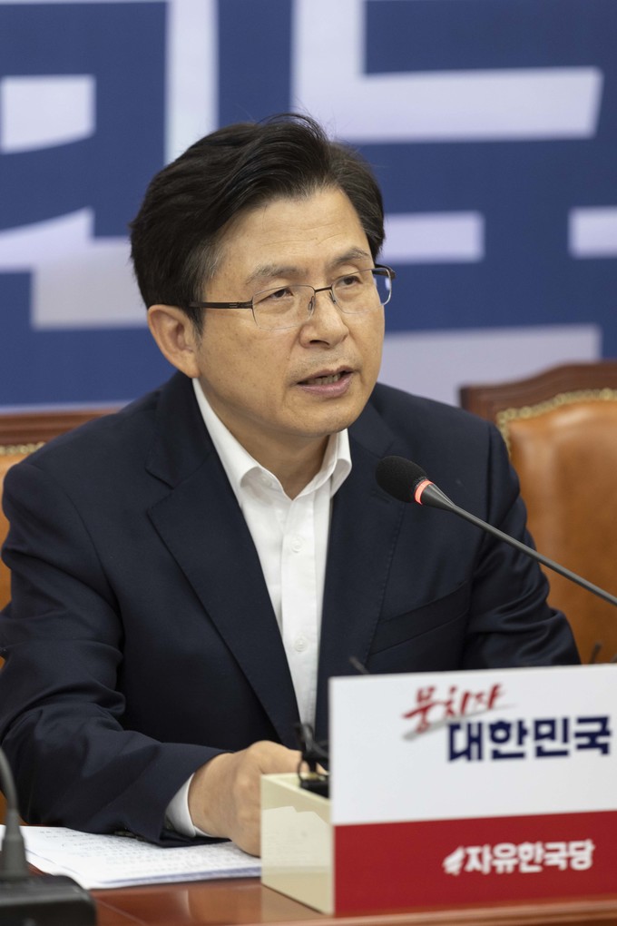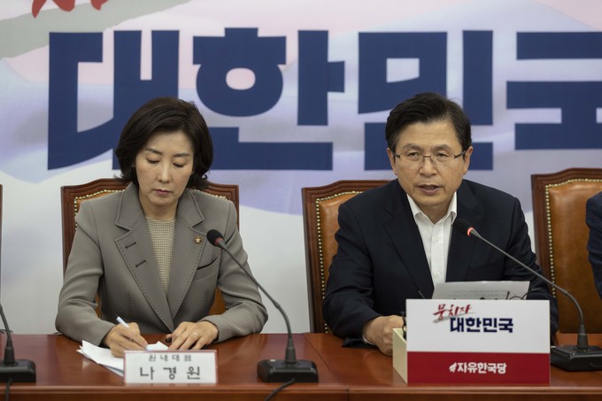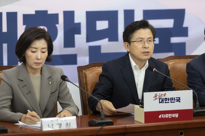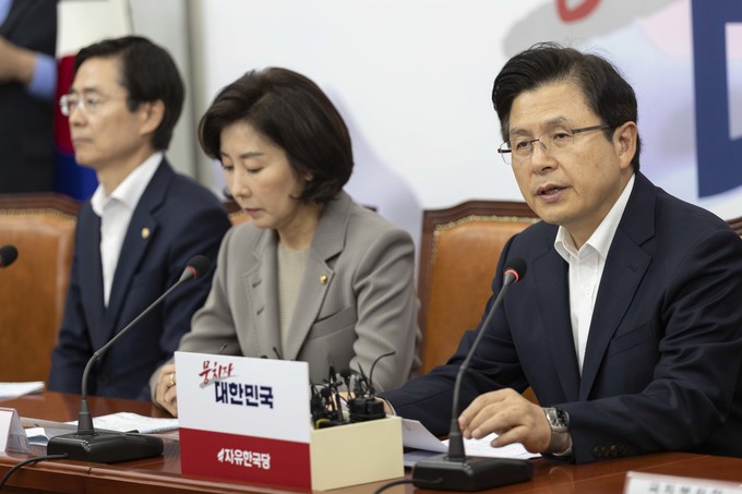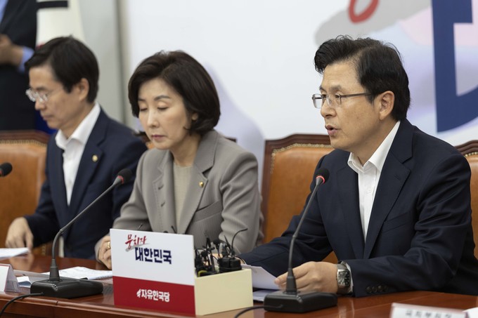 자유한국당 황교안 대표(오른쪽)가 4일 오전 서울 여의도 국회에서 열린 한국당 당대표 및 최고위원-중진의원 연석회의에 참석해 발언하고 있다.