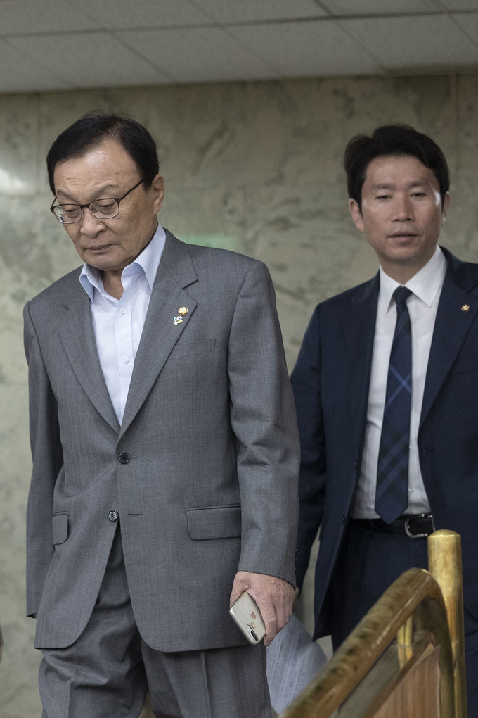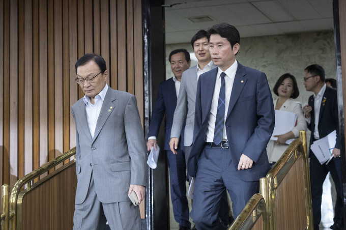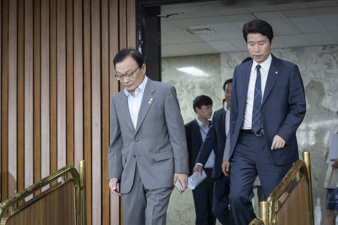 더불어민주당 이해찬 대표(왼쪽)와 이인영 원내대표가 26일 오전 서울 여의도 국회에서 열린 확대간부회의에 참석하고 있다.