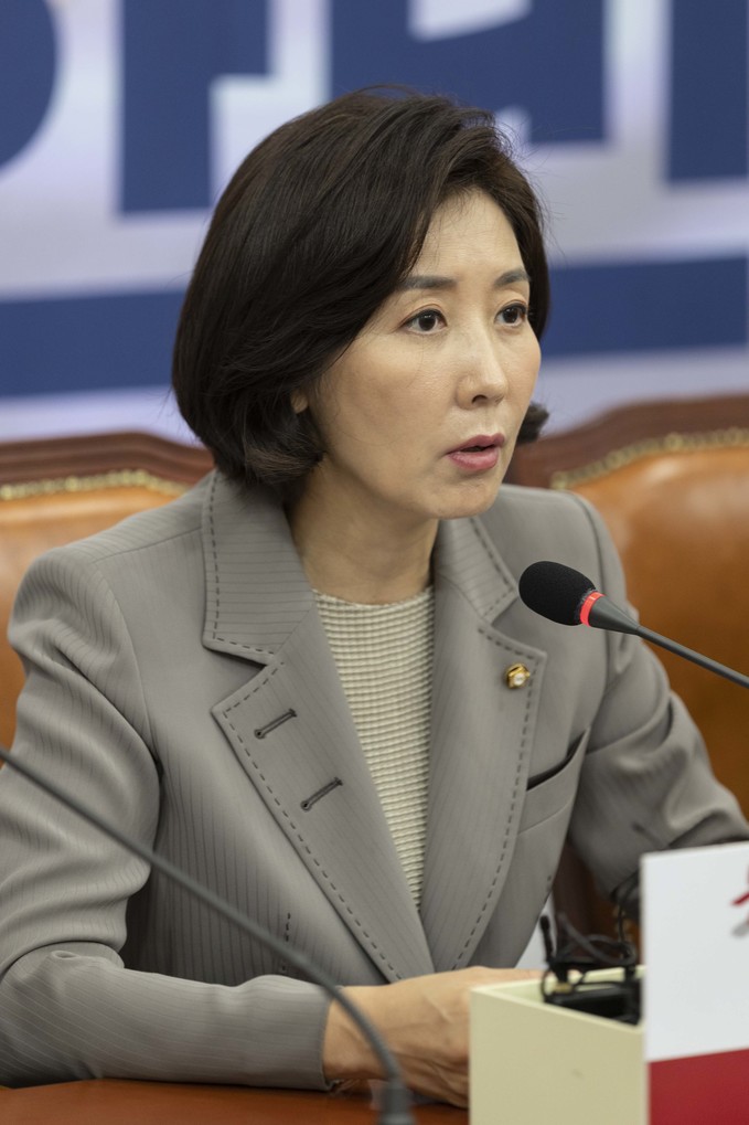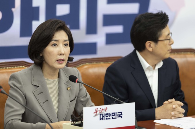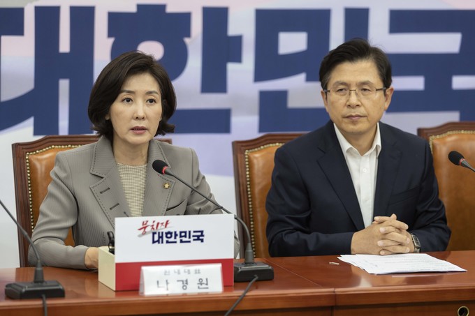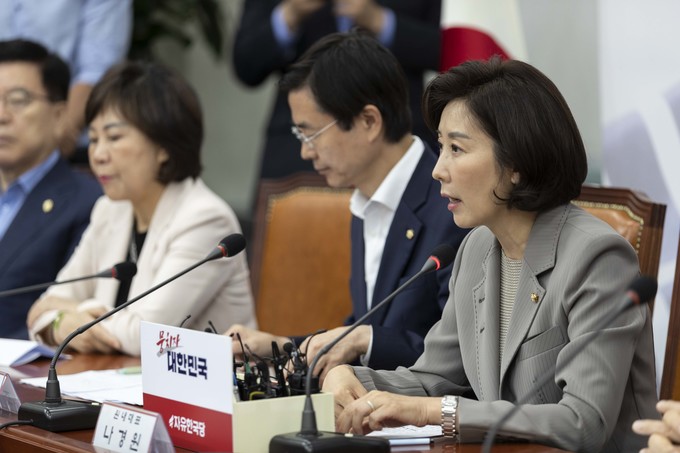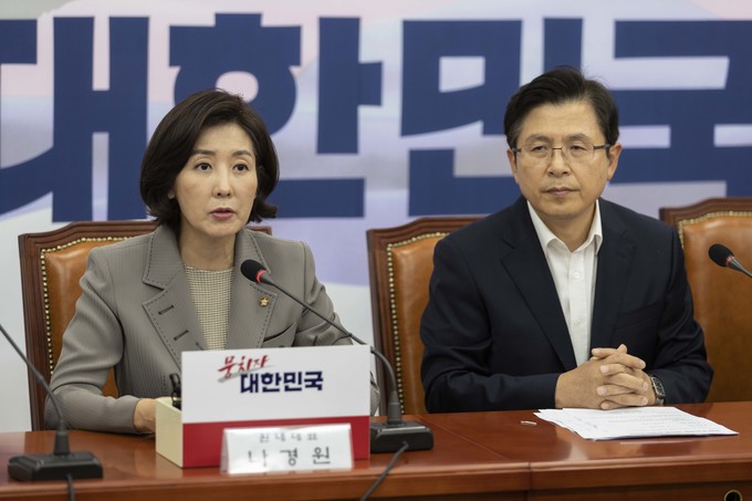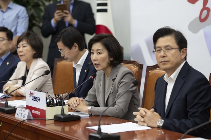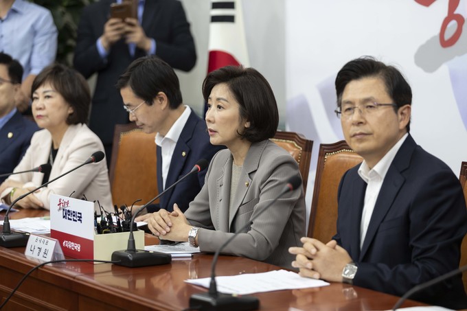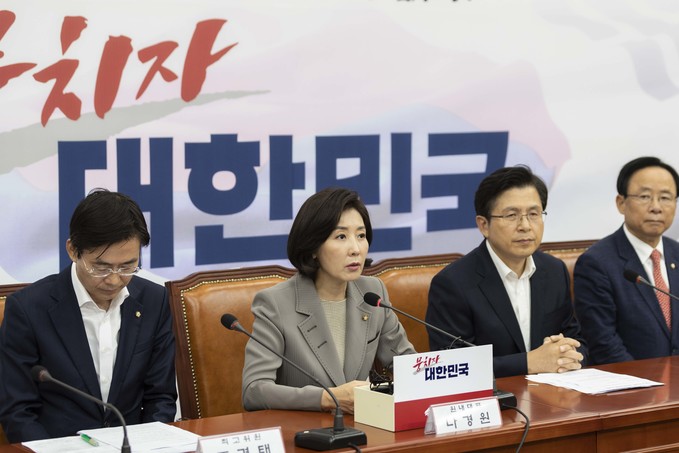자유한국당 나경원 원내대표(왼쪽)가 4일 오전 서울 여의도 국회에서 열린 한국당 당대표 및 최고위원-중진의원 연석회의에 참석해 발언하고 있다.