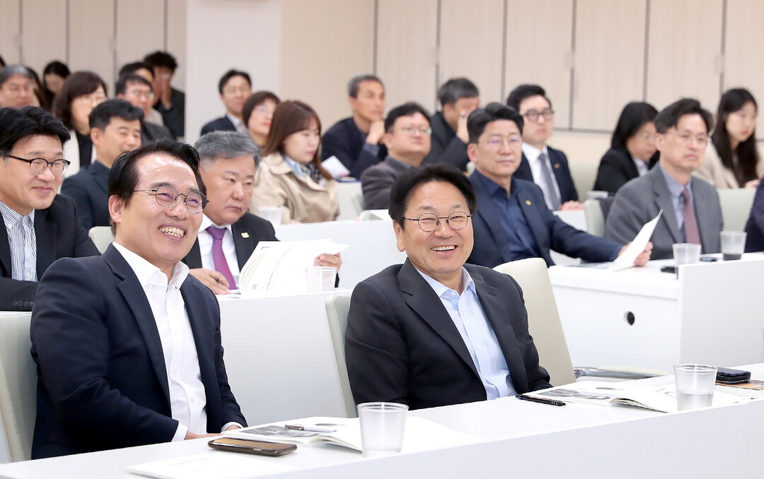 | ▲ 강기정 광주광역시장이 28일 오전 시청 3층 중회의실에서 열린 제11회 정책포럼에 참석해 임문영 더불어민주당 디지털특별위원장의 'AX와 광주' 인공지능, 디지털 전환과 지역의 준비라는 주제로 하는 특강을 듣고 있다. [광주광역시 제공] |