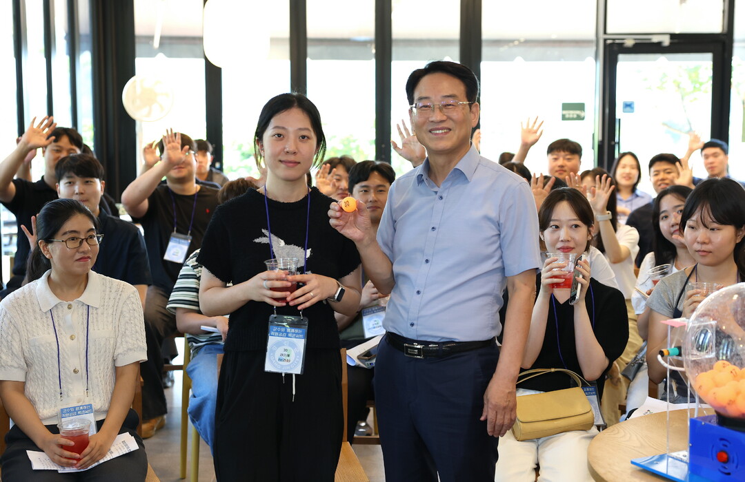 | ▲ 강진원 전남 강진군수가 MZ세대 공직자 40명과 함께 대화 시간을 가진 뒤 추첨에 당첨된 보건소 강은예 주무관에게 강진사랑상품권을 전달한 뒤 기념촬영을 하고 있다. [강진군 제공] |