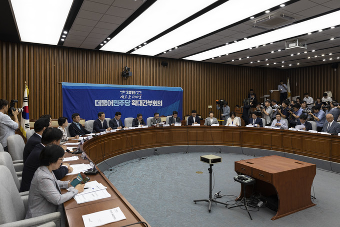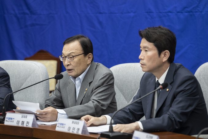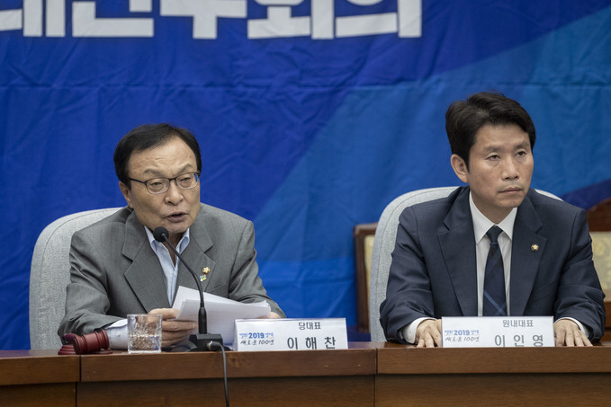 더불어민주당 이해찬 대표(왼쪽)가 26일 오전 서울 여의도 국회에서 열린 확대간부회의를 주재하고 있다. 이해찬 대표는 이날 회의에서 "국회공전 80일 만에 일궈낸 합의가 한국당의 당리당략 때문에 두시간도 되지 않아 물거품이 됐다"며 "이 정도로 무책임한 정당이면 공당의 자격이 없다고 생각한다"고 비판했다.