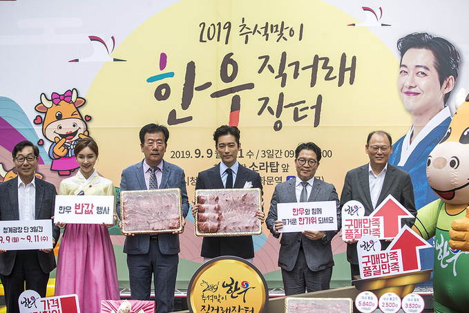 2019 한우 홍보대사 배우 남궁민, 민경천 한우자조금 위원장 등 관계자가 9일 오전 서울 중구 청계광장 소라탑에서 열린 2019 추석맞이 한우직거래 장터에서 포즈를 취하고 있다.
