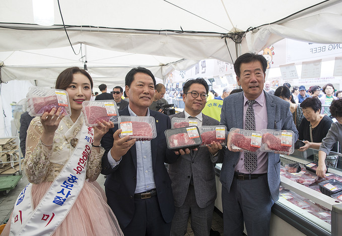 민경천 한우자조금 위원장 등 관계자들이 9일 오전 서울 중구 청계광장 소라탑에서 열린 2019 추석맞이 한우직거래 장터에서 한우를 선보이고 있다.