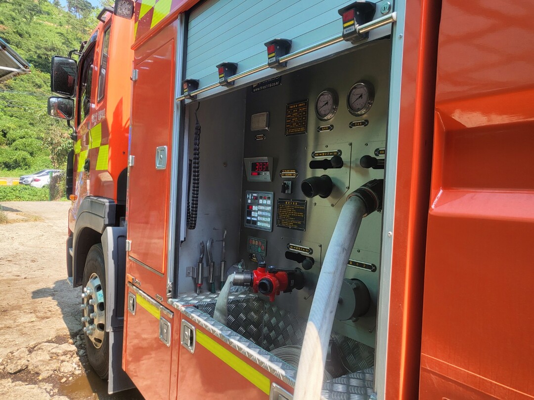 | ▲ 밀양소방서 하남119안전센터 소방차량이 집단폐사 위기에 처한 상남면 돼지 농장에 식수를 공급하고 있다. [독자 제공] |