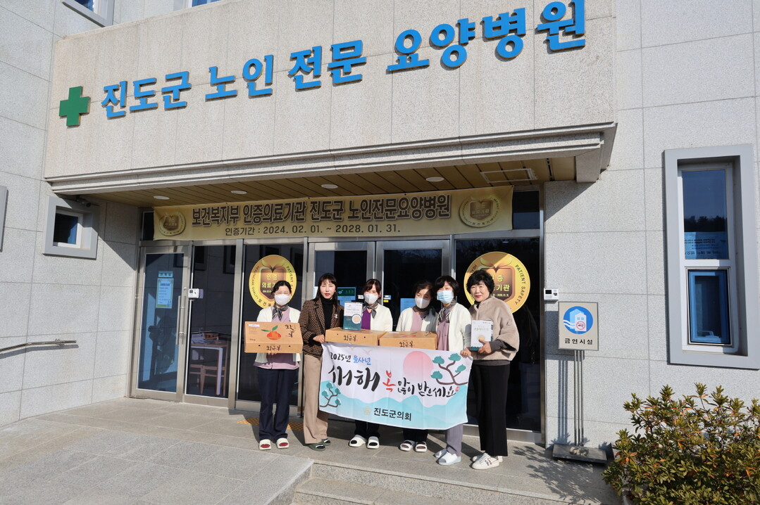 | ▲ 박금례 진도군의회 의장이 진도군 노인 전문 요양병원을 방문해 위문품을 전달한 훈훈한 설 명절 나기를 응원하고 있다. [진도군의회 제공] |