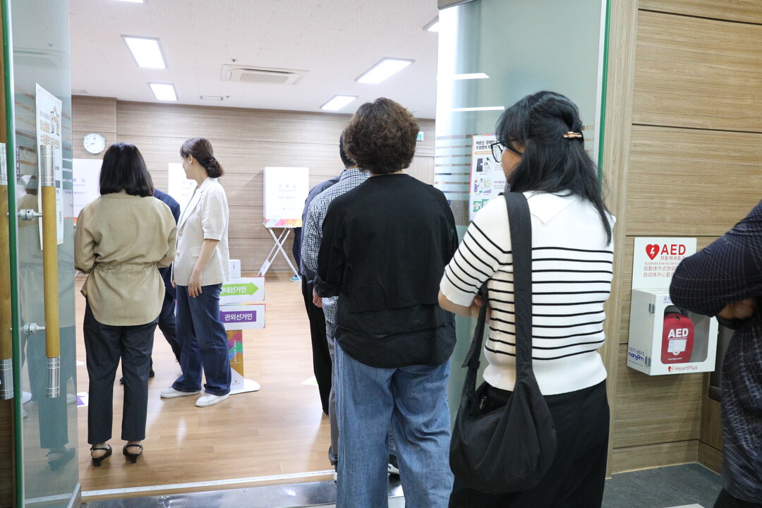 | ▲ 제21대 대통령선거 사전투표 첫날인 29일 아침 목포시 신흥동 사전투표소에서 주민들이 사전투표에 나서고 있다. [강성명 기자] |