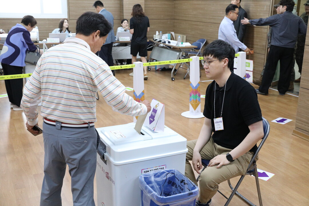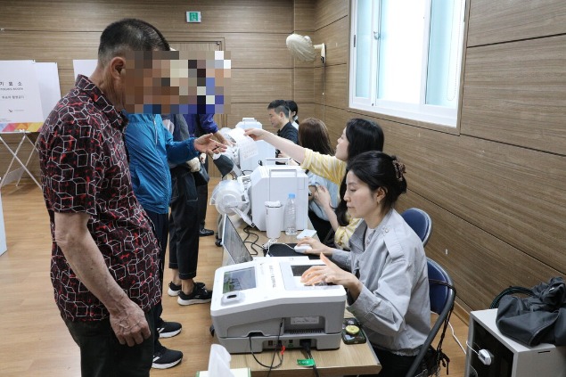| ▲ 제21대 대통령선거 사전투표 첫날인 29일 아침 목포시 신흥동 사전투표소에서 주민들이 사전투표를 하기 위해 용지를 받고 있다. [강성명 기자] |