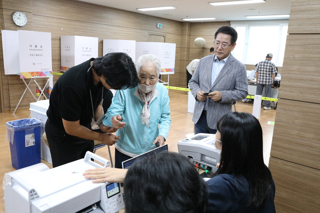 | ▲ 제21대 대통령선거 사전투표 첫날인 29일 아침 목포시 신흥동 사전투표소에서 고령의 할머니가 사무원의 도움을 받아 사전투표에 나서고 있다. [강성명 기자] |