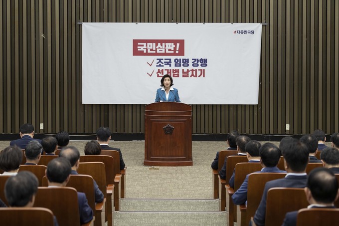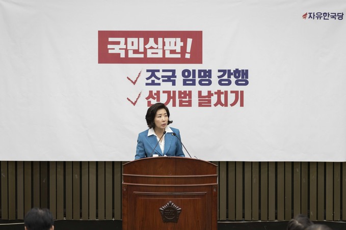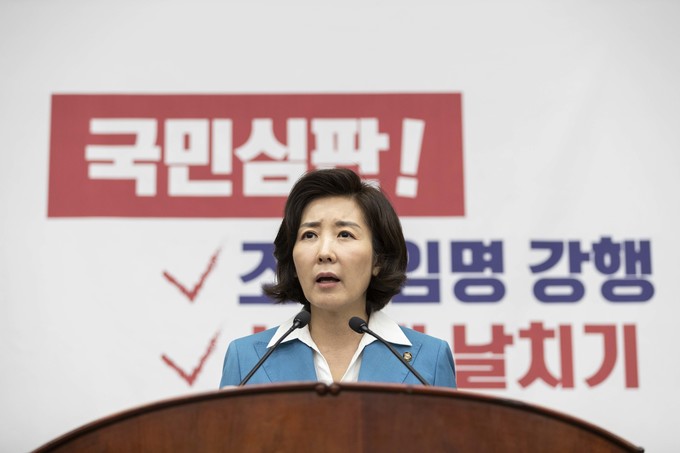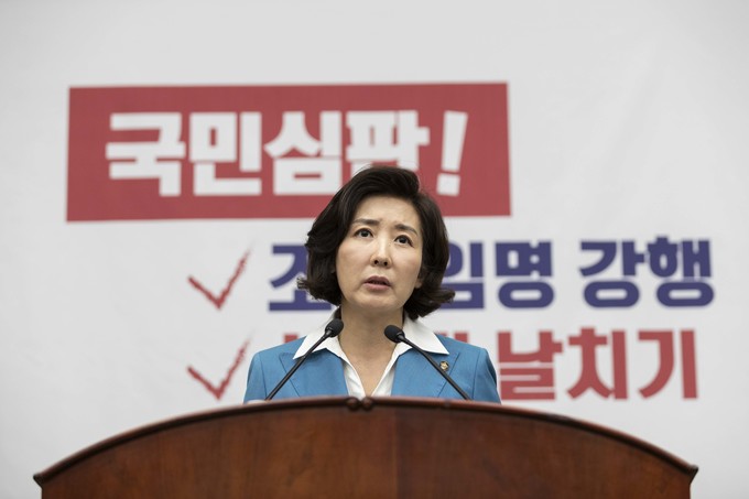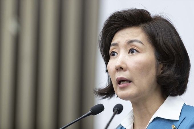 자유한국당 나경원 원내대표가 29일 오전 서울 여의도 국회에서 열린 한국당 긴급의원총회에 참석해 발언하고 있다.