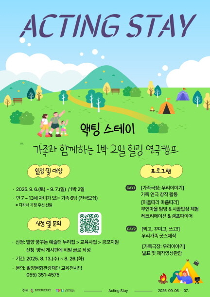 경남 밀양문화관광재단(이사장 안병구 시장)은 13일부터 26일까지 '액팅 스테이(Acting Stay)' 1기수에 참여할 가족을 모집한다고 밝혔다.