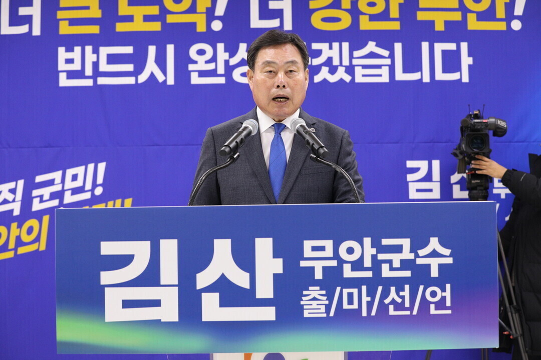 | ▲ 지난달 31일 김산 무안군수가 무안군청에서 3선 도전을 위한 출마 선언을 하고 있다. [강성명 기자] |