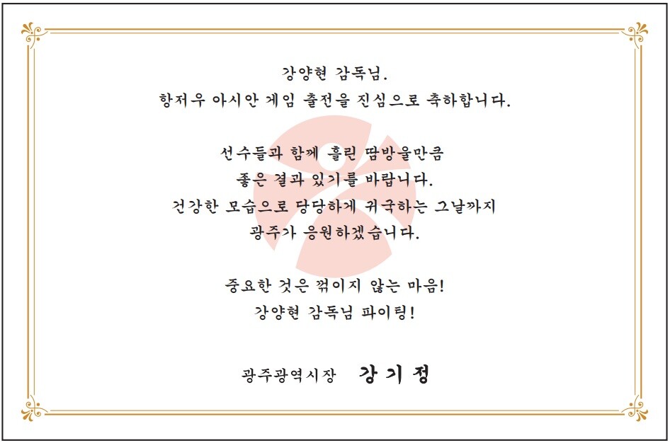 | ▲ 강기정 광주시장이 항저우 아시안게임 출전 강양현 감독에게 보낸 격려 카드 (강양) |