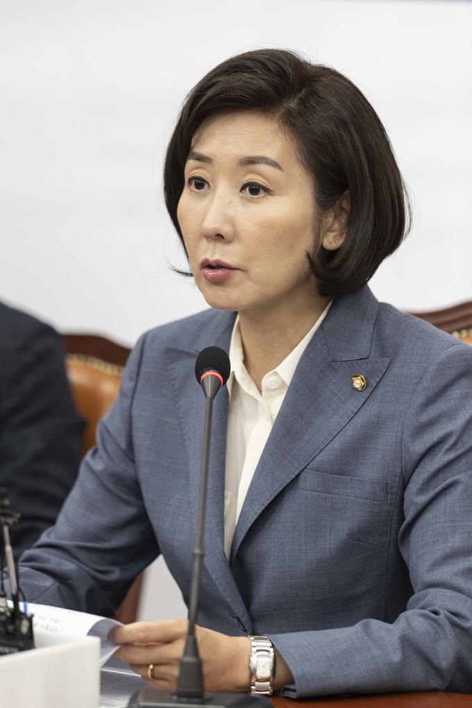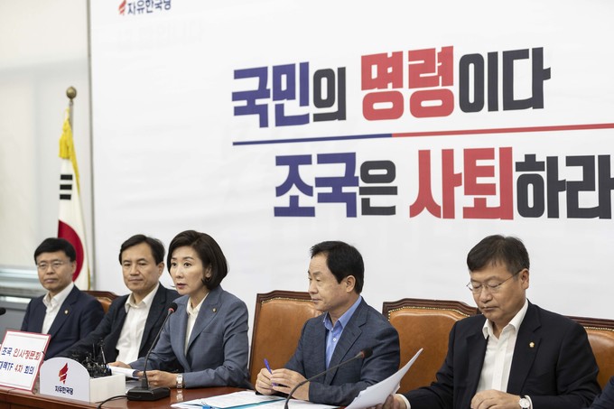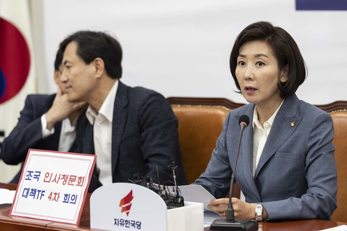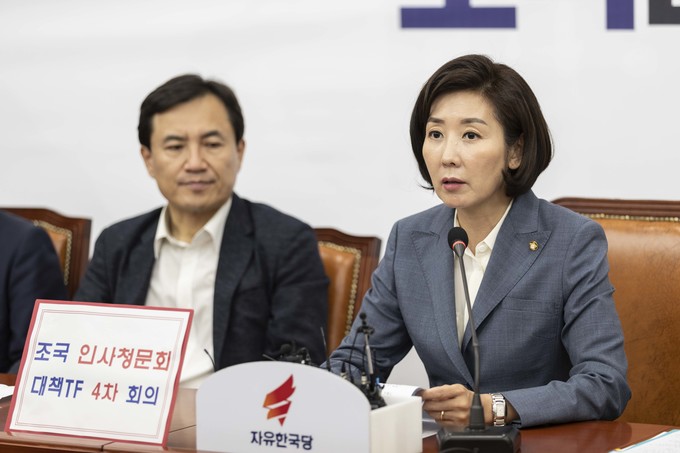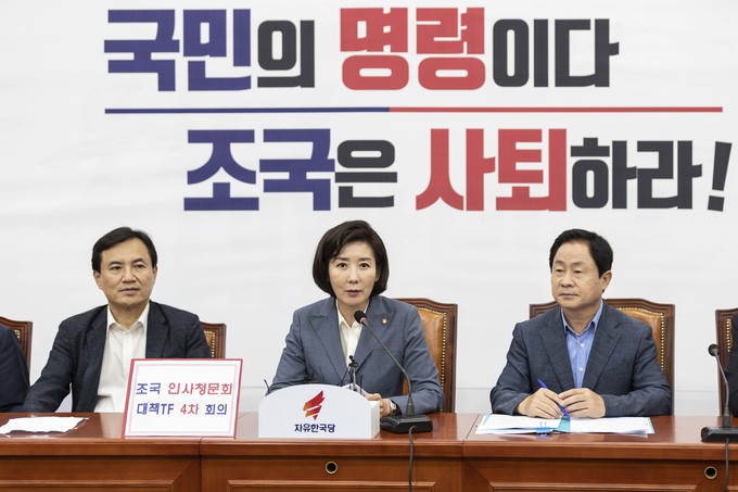 자유한국당 나경원 원내대표(왼쪽 세번째)가 23일 오전 서울 여의도 국회에서 열린 '조국 인사청문회 대책TF' 4차 회의에 참석해 발언하고 있다.
