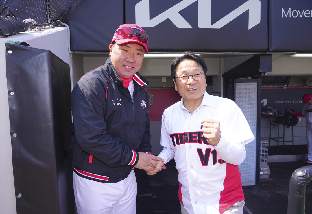 | ▲ 강기정 광주광역시장이 22일 오후 광주KIA챔피언스필드에서 열린 KIA 타이거즈와 NC 다이노스의 홈개막전에 참석해 KIA 이범호 감독과 승리를 기원하고 있다. [광주광역시 제공] |