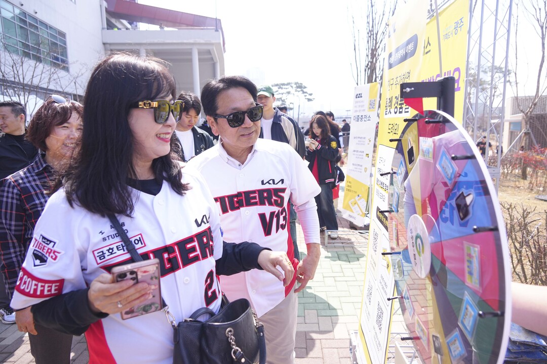 | ▲ 강기정 광주광역시장이 지난 22일 오후 광주KIA챔피언스필드에서 열린 KIA 타이거즈와 NC 다이노스의 홈개막전에서 광주시 반값 대중교통 카드 G-패스 홍보관을 찾아 시민들과 룰렛이벤트에 참여하고 있다. [광주광역시 제공] |