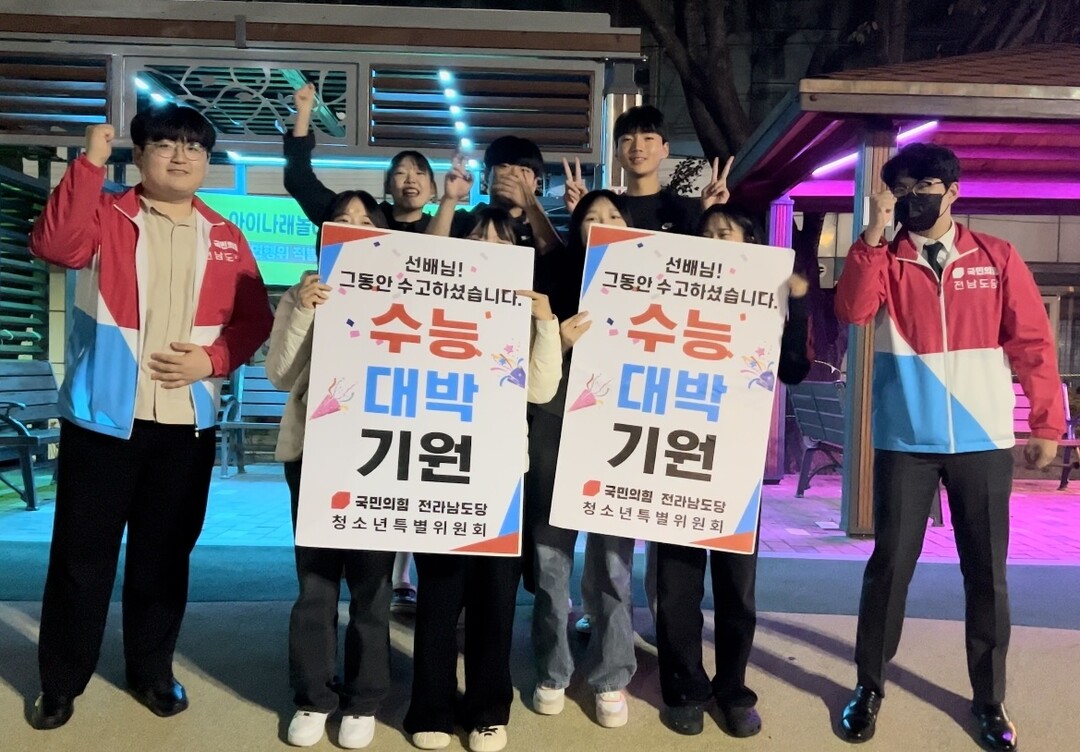 29일 국민의힘 전남도당에 따르면 이번 캠페인은 고등학교 2학년에 재학 중인 국민의힘 전남도당 청소년특별위원회 김상영 위원장과 위원들이 모여 순천시와 여수시 일대 학원가에서 수능을 준비하는 선배를 응원하기 위해 행사를 기획하고 진행했다.