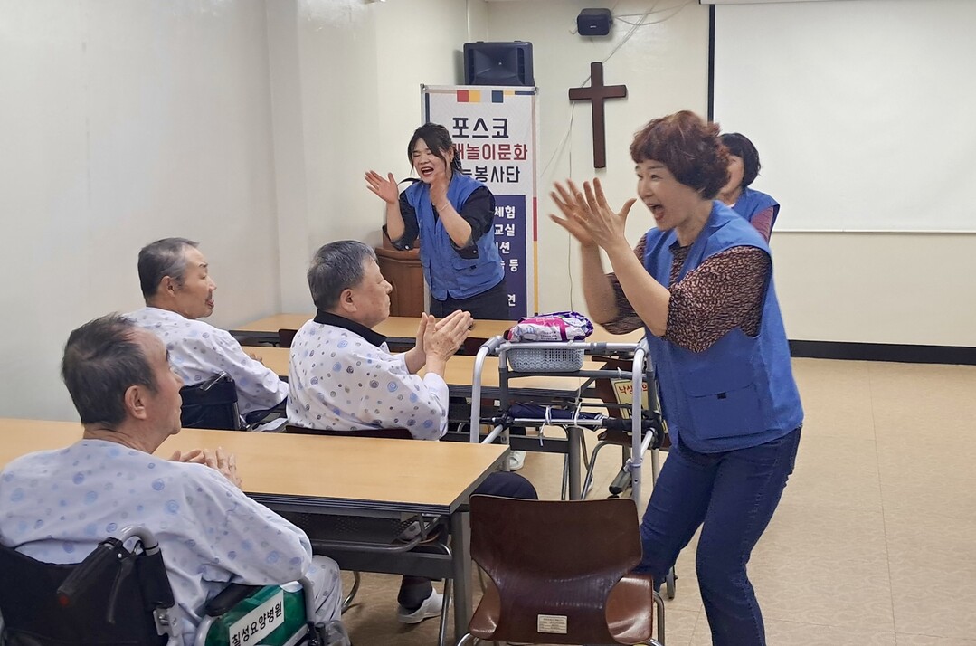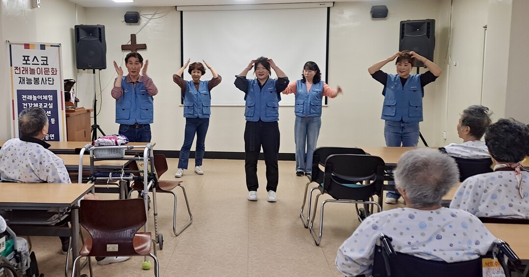 | ▲ 포스코 광양제철소 전래놀이 문화 재능봉사단이 지난 24일 광양시 칠성요양병원을 방문해 고령자를 위해 실버체조와 트로트 노래로 구성된 공연을 선사하며 일상에 활력을 더해주고 있다. 재능봉사단은 △옛날 전래놀이 △웃음치료 △마술 등으로 지역민과 소통하고 있다. [광양제철소 제공] |