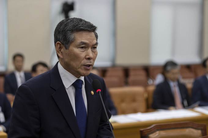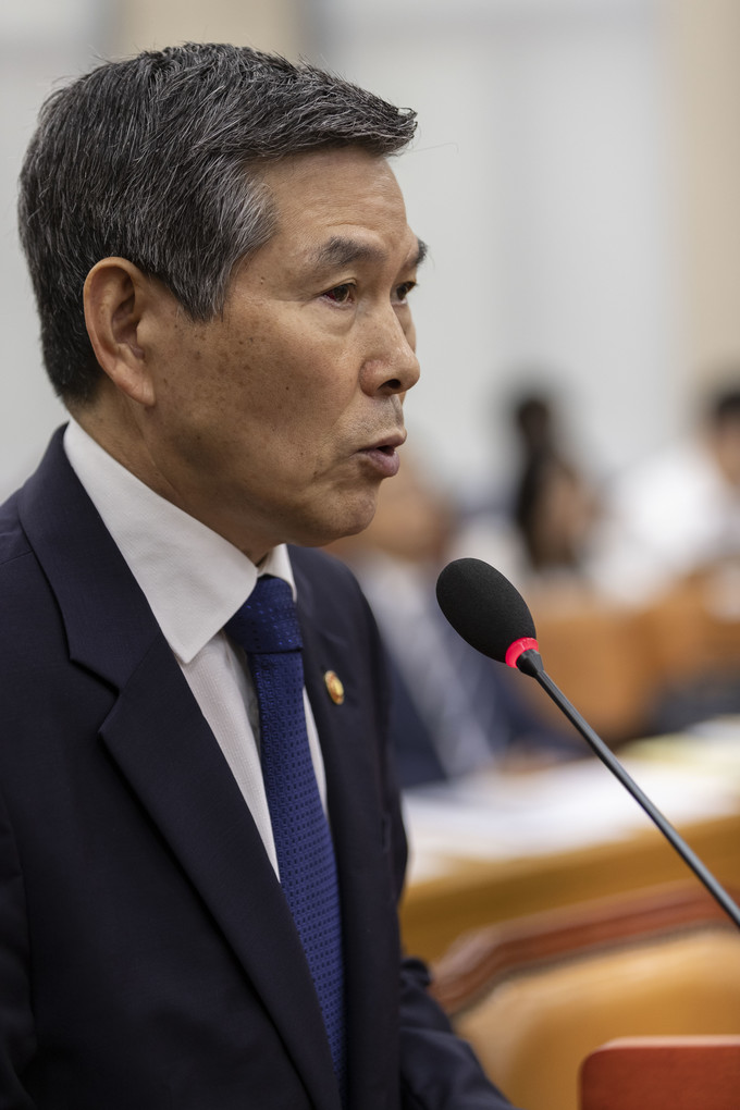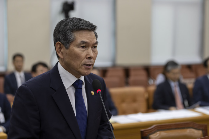 정경두 국방부 장관이 3일 오전 서울 여의도 국회에서 열린 국회 국방위원회 전체회의에 출석해 업무보고를 하고 있다.