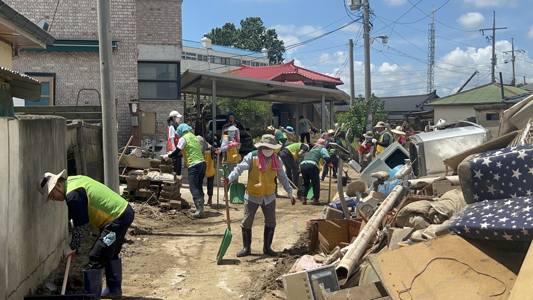 | ▲자원봉사단체가 충남 수해지역에 복구작업을 하고 있다.[대전시 제공] |