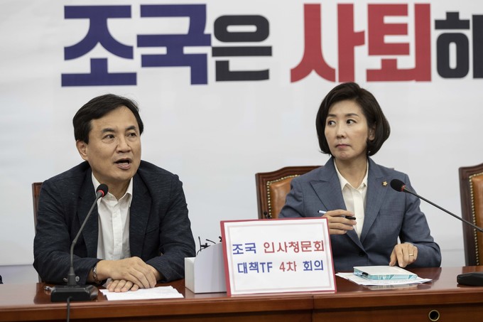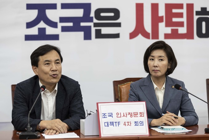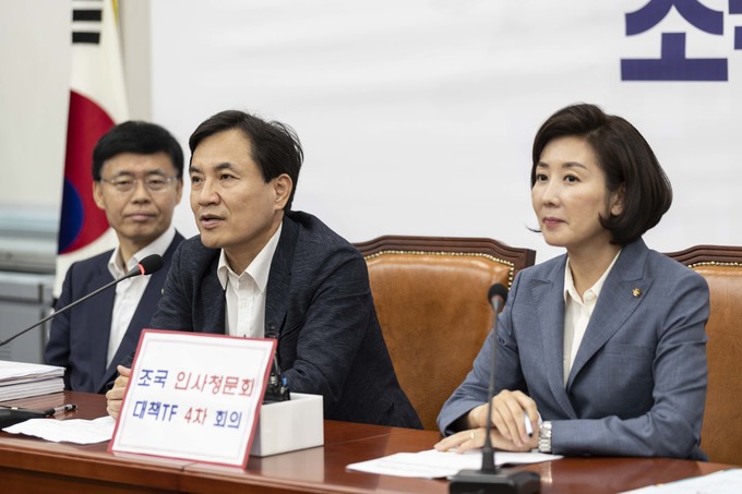 자유한국당 김진태 의원(가운데)이 23일 오전 서울 여의도 국회에서 열린 '조국 인사청문회 대책TF' 4차 회의에 참석해 발언하고 있다.