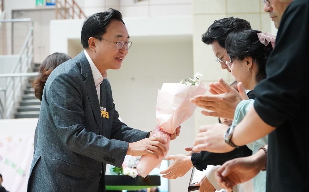 | ▲ 윤병태 나주시장이 지난 16일 나주종합스포츠파크에서 열린 가족축제에서 민주적 가족문화확산, 가족관계 증진에 기여한 유공자 6명에게 표창장을 수여하고 있다. [나주시 제공] |