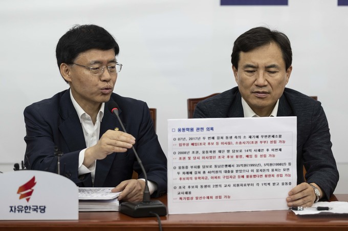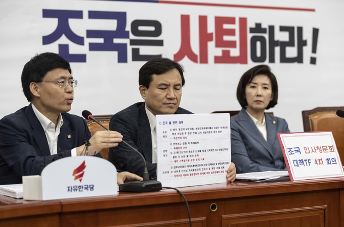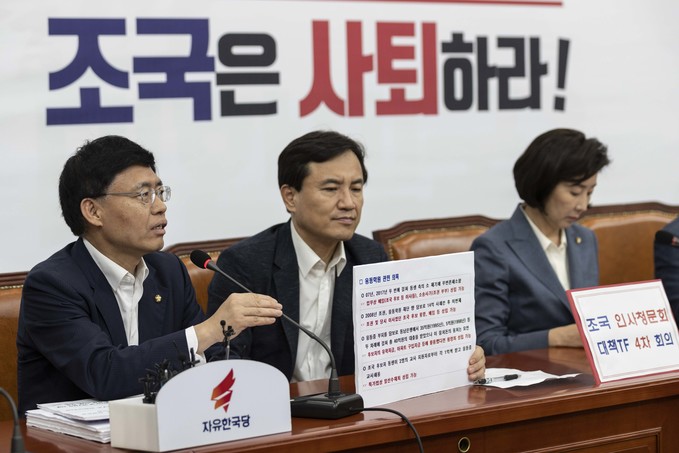 자유한국당 조경태 최고위원(왼쪽)가 23일 오전 서울 여의도 국회에서 열린 '조국 인사청문회 대책TF' 4차 회의에 참석해 발언하고 있다.