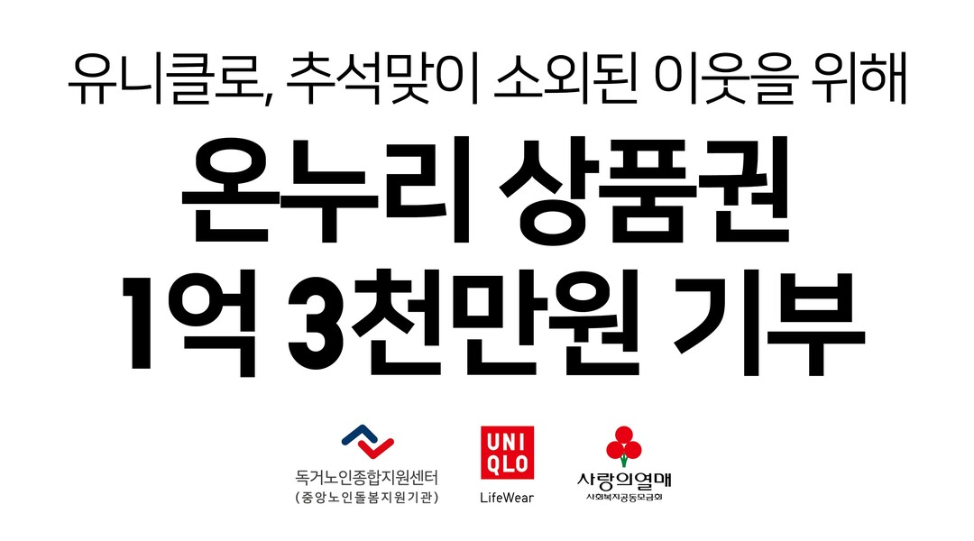 유니클로(UNIQLO)는 추석 명절을 앞두고 독거노인 및 기초생활수급자 등 사회 취약계층을 돕기 위해 온누리상품권 1억3300만 원을 기부한다고 13일 밝혔다.