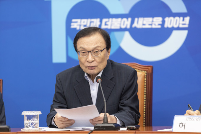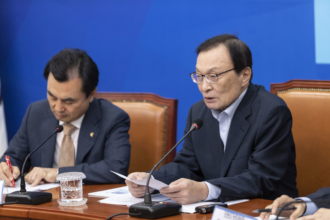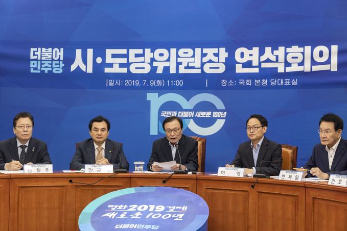 더불어민주당 이해찬 대표(가운데)가 9일 오전 서울 여의도 국회에서 열린 '전국 시도당위원장 연석회의'를 주재하고 있다.
