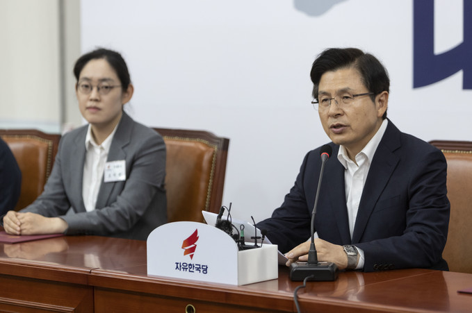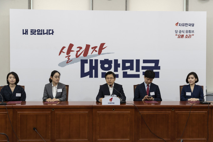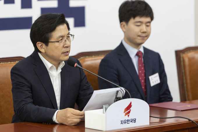 자유한국당 황교안 대표(가운데)가 1일 오전 서울 여의도 국회에서 열린 청년부대변인 임명장 수여식에서 발언하고 있다.