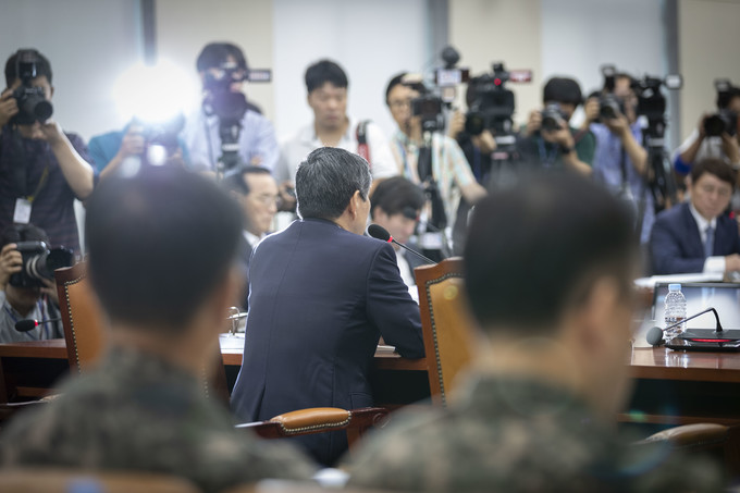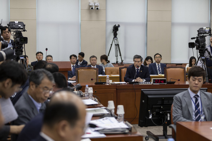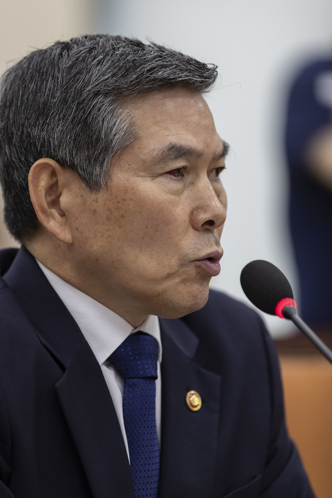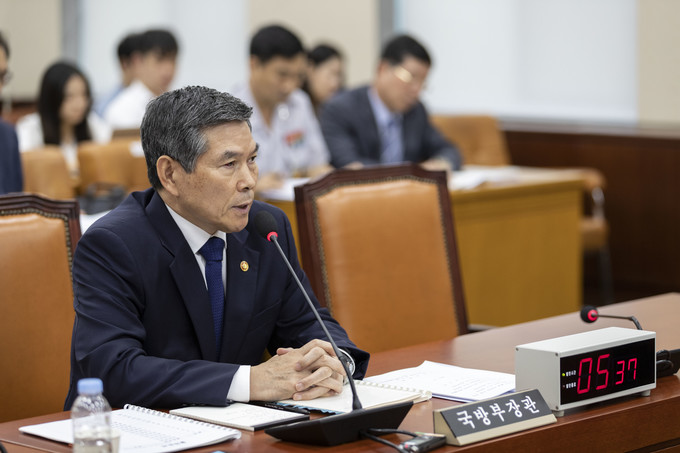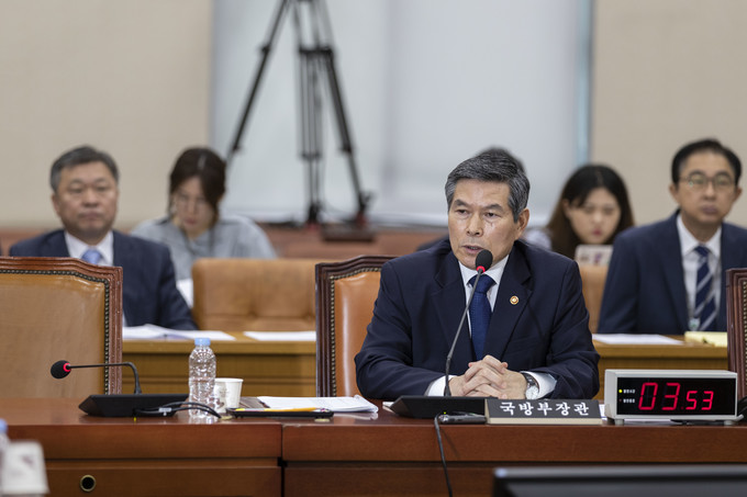 정경두 국방부 장관이 3일 오전 서울 여의도 국회에서 열린 국회 국방위원회 전체회의에 출석해 의원 질의에 답하고 있다.