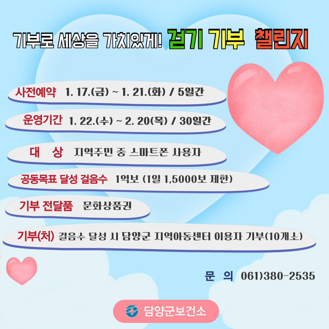 전남 담양군이 새해 맞이 전 군민을 대상으로 기부 걷기 챌린지를 운영한다고 15일 밝혔다.