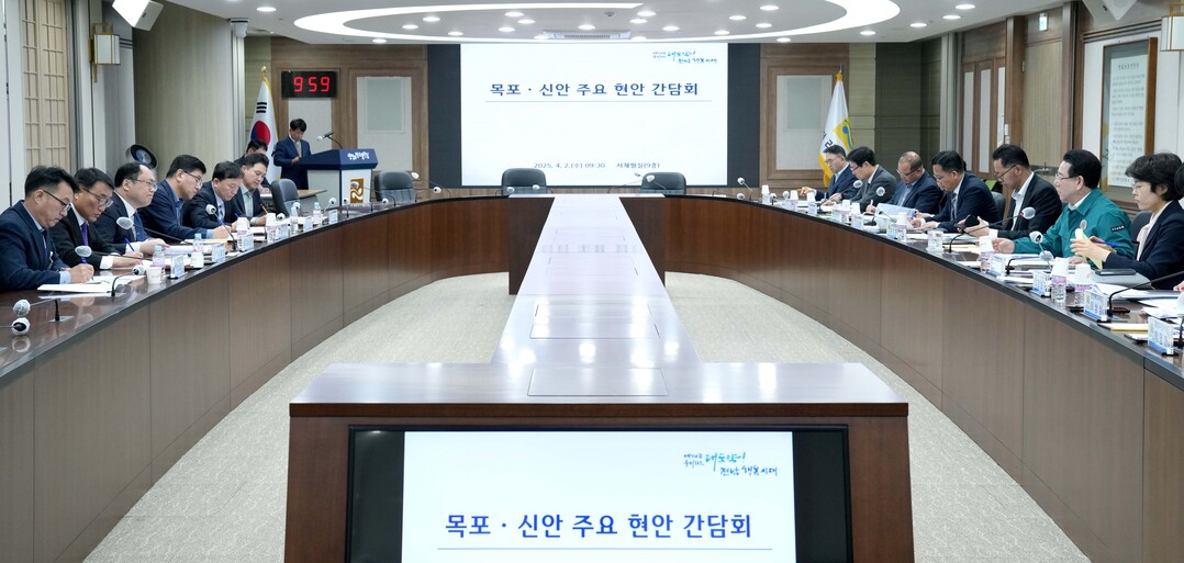 | ▲ 김영록 전라남도지사가 2일 오전 도청 서재필실에서 열린 목포·신안 주요 현안 간담회에서 도-시·군 현안 협력 방안 등에 대해 논의하고 있다. [전남도 제공] |
