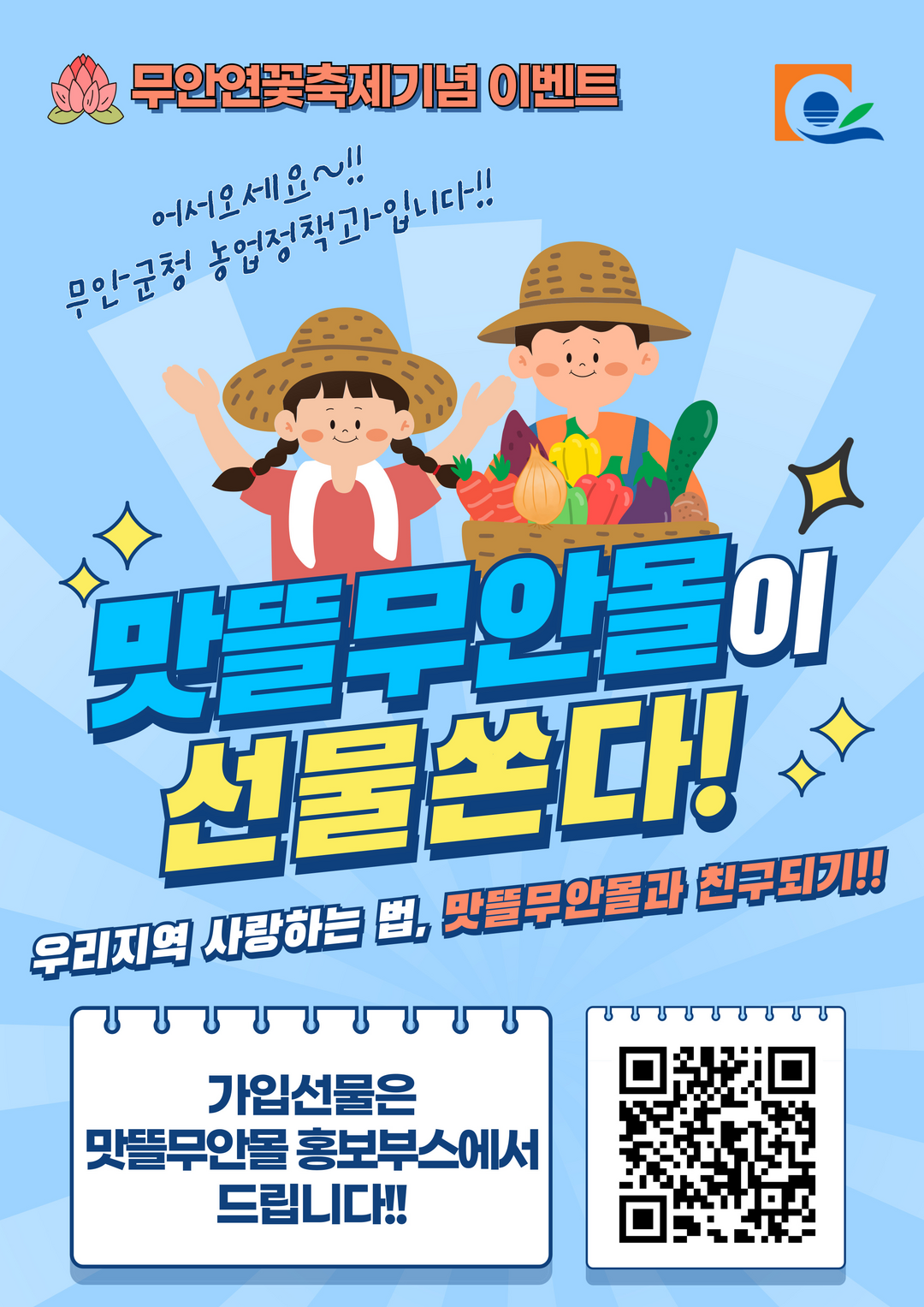 이번 행사는 무안연꽃축제 기간인 오는 25일부터 28일까지 축제장 내 홍보부스에서 진행되며, 맛뜰무안몰 신규 회원 가입 시 장바구니, 부채 등 선물을 증정한다.