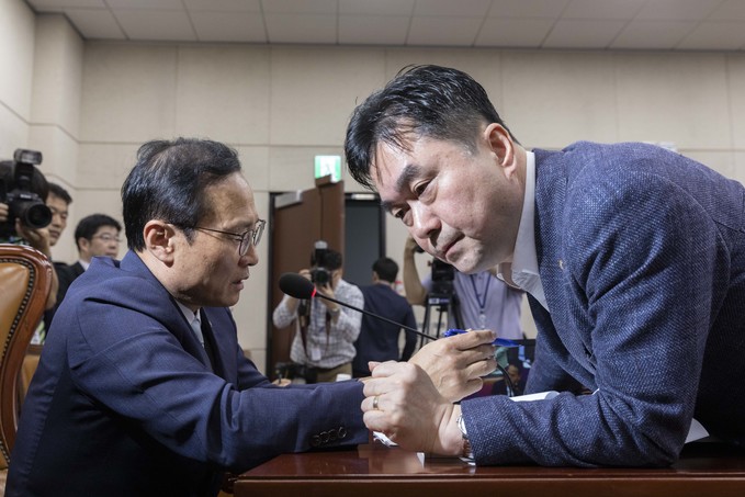 홍영표 정개특위 위원장(왼쪽)이 29일 오전 서울 여의도 국회 정개특위 전체회의장에서 김종민 간사와 대화를 하고 있다.