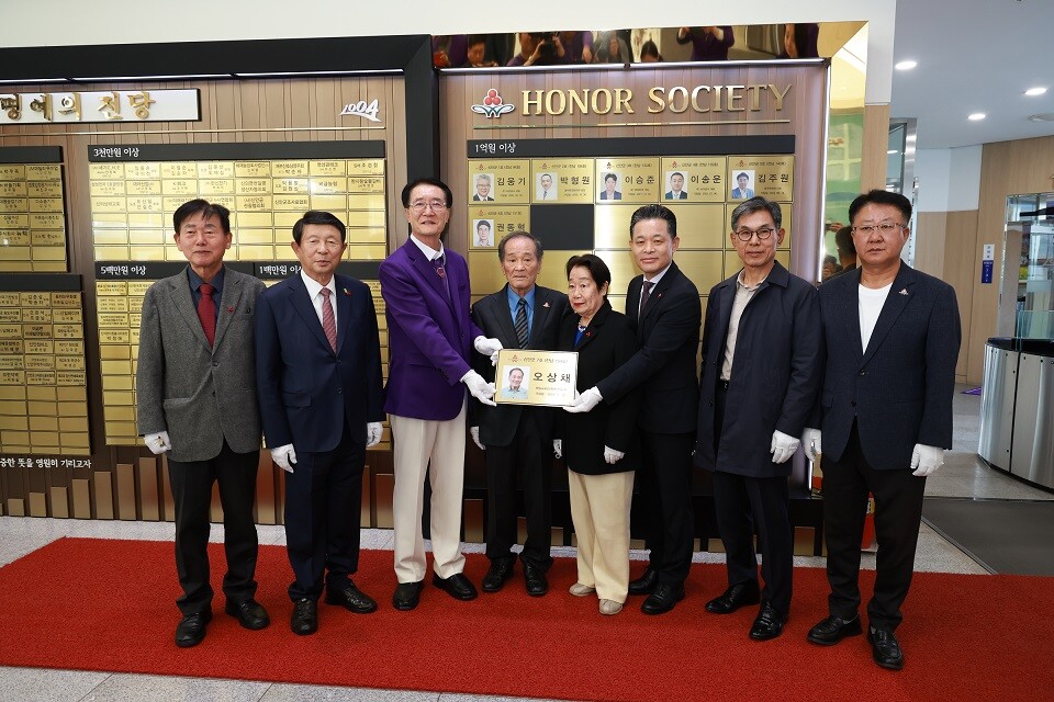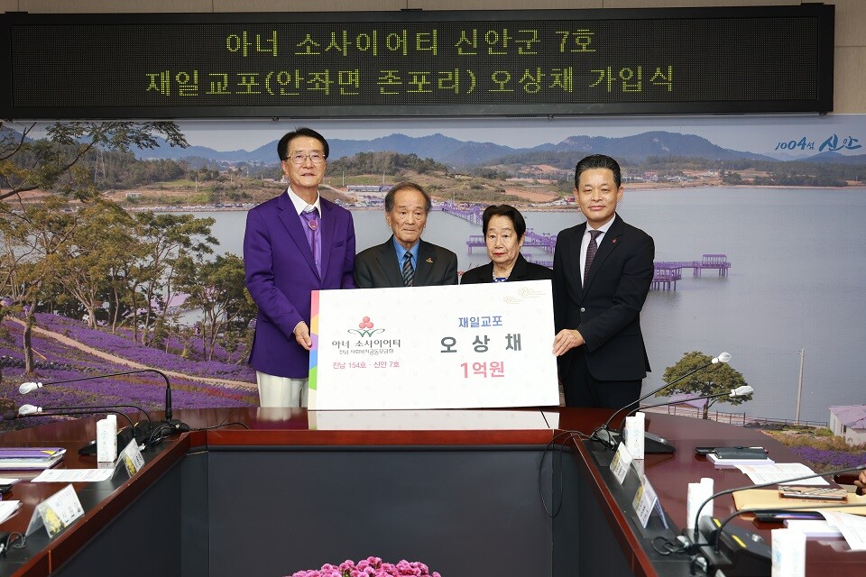 | ▲ 지난 12일 자수성가 재일교포인 오상채 씨가 신안군에 성금 1억 원을 기부하며 신안군 7호 아너 소사이어티 가입식을 갖고 있다. [신안군 제공] |