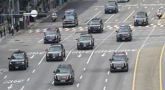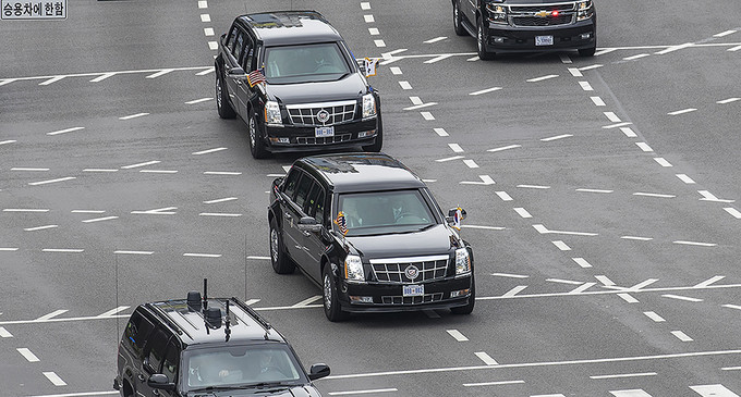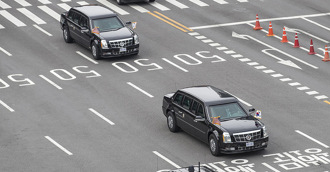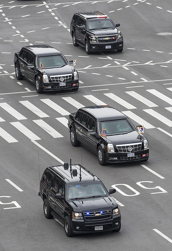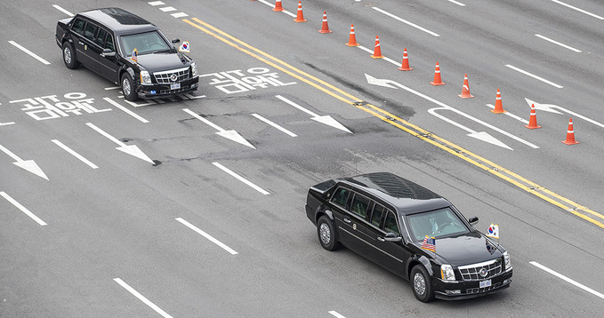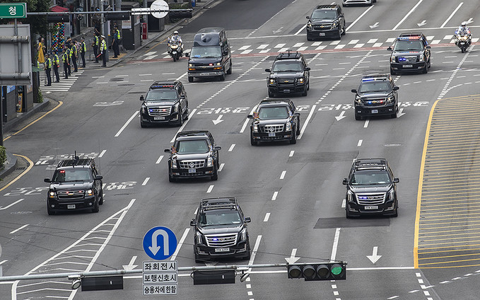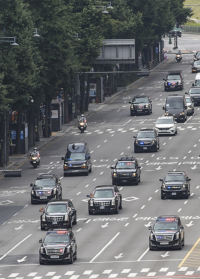 취임 후 두 번째 방한한 도널드 트럼프 미국 대통령이 탑승한 차량 행렬이 30일 오전 서울 용산구 그랜드하얏트호텔에서 출발해 세종대로를 지나 청와대로 향하고 있다.