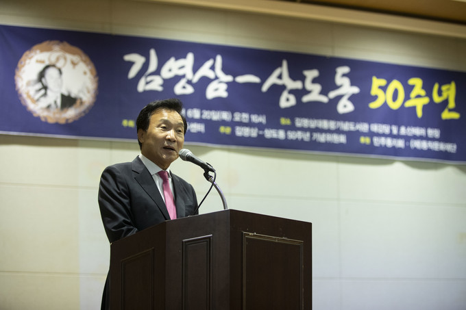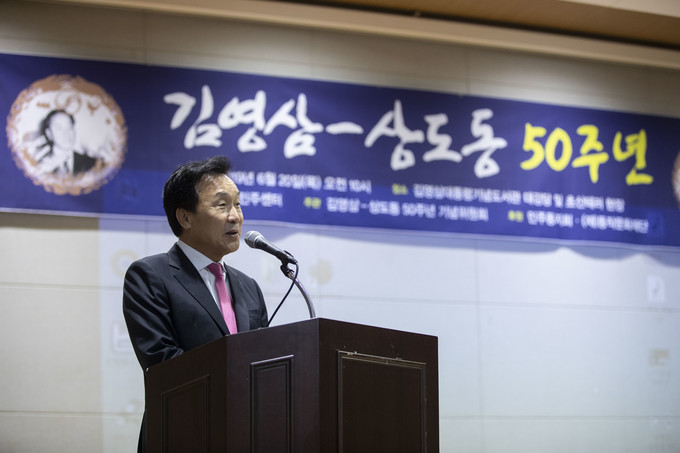 손학규 바른미래당 대표가 20일 오전 서울 동작구 김영삼대통령기념도서관에서 열린 '김영삼-상도동 50주년 기념행사'에서 축사를 하고 있다.
