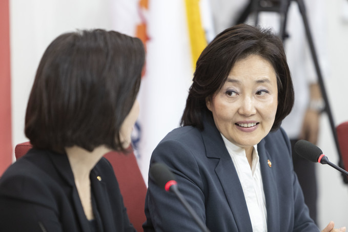 박영선 중소벤처기업부 장관(오른쪽)이 1일 오전 서울 여의도 국회 원내대표실에서 자유한국당 나경원 원내대표를 예방해 인사를 나누고 있다.