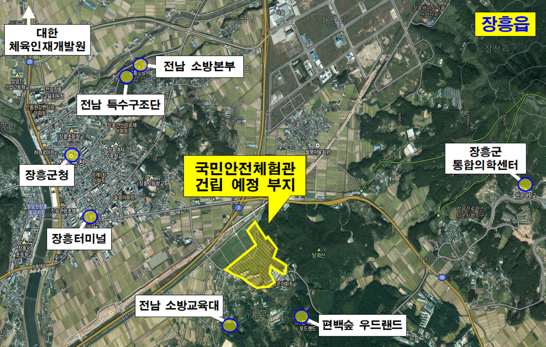 장흥읍 우산리 일원에 조성되는 전남 국민안전체험관은 사업비 370억 원이 투입되며, 지상4층, 지하1층, 연면적 6000㎡ 규모로 2024~2028년까지 5년 동안 설계·시설결정·공사를 진행하고 2028년 문을 열 예정이다.
