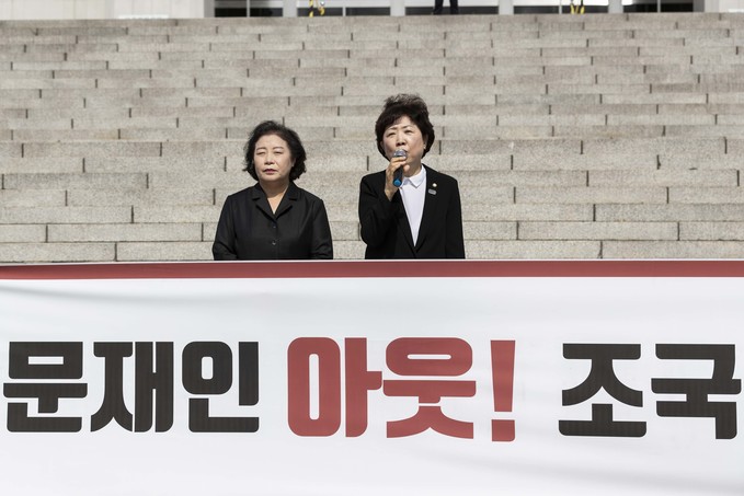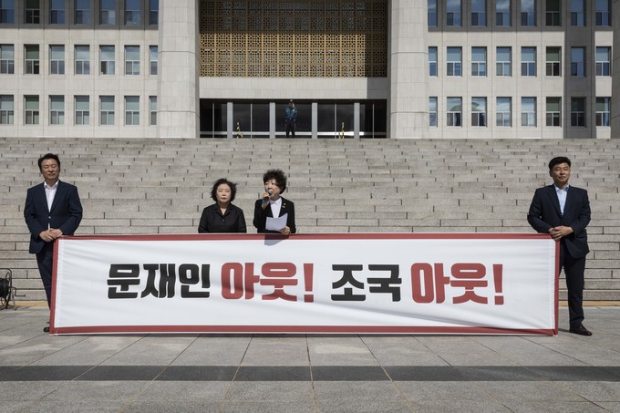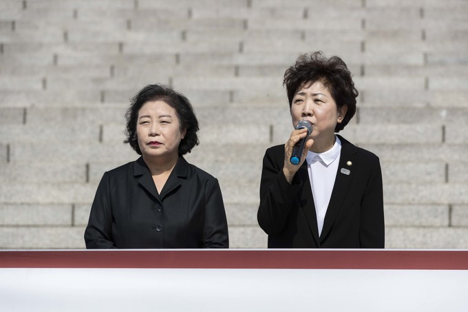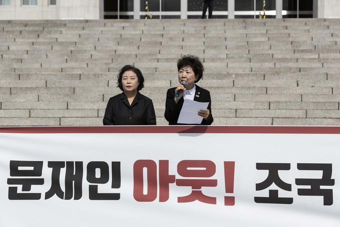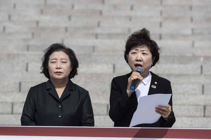 자유한국당 박인숙 의원(오른쪽)이 11일 오전 서울 여의도 국회 본관 앞 계단에서 조국 법무부장관 사퇴 촉구 삭발식을 앞두고 발언하고 있다.