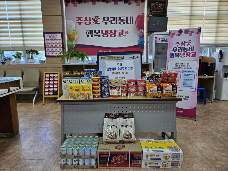 기부자는 소비쿠폰으로 구입한 즉석밥과 통조림 등 다양한 생필품을 주상면 행정복지센터에 설치된 '공유냉장고'에 전달했다.