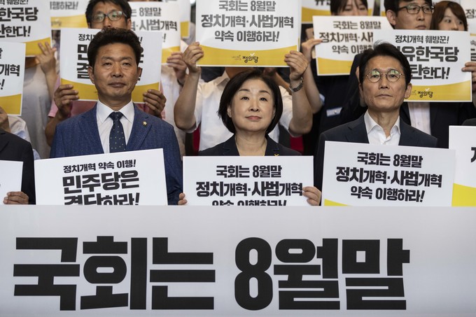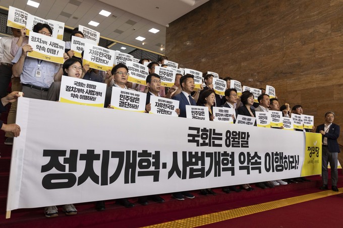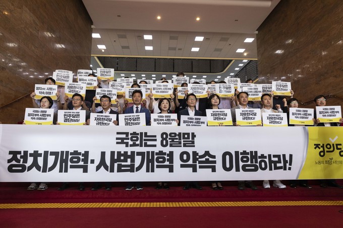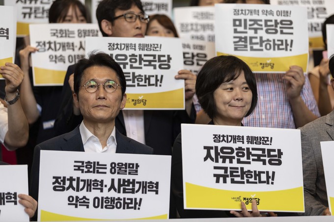 윤소하 전 원내대표(왼쪽)와 이정미 전 대표 등 정의당 지도부가 20일 오전 서울 여의도 국회 로텐더홀 계단에서 열린 '정치개혁-사법개혁 약속이행 촉구 비상행동선포식'에 참석해 피켓을 들고 있다.