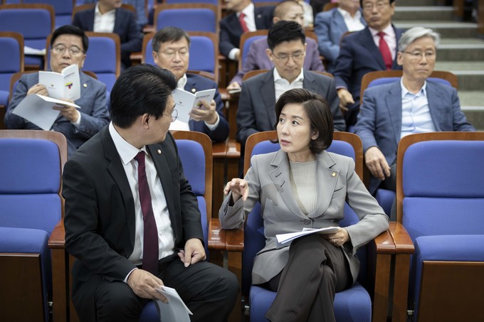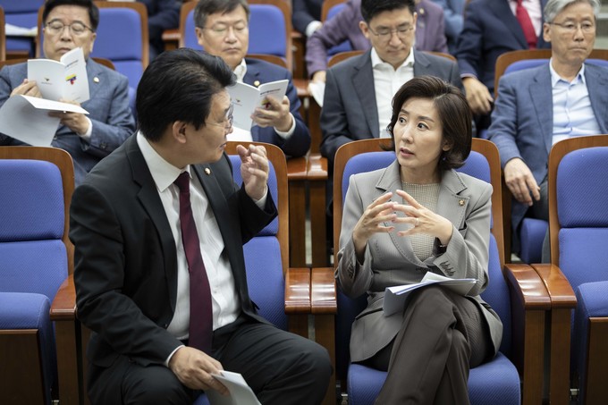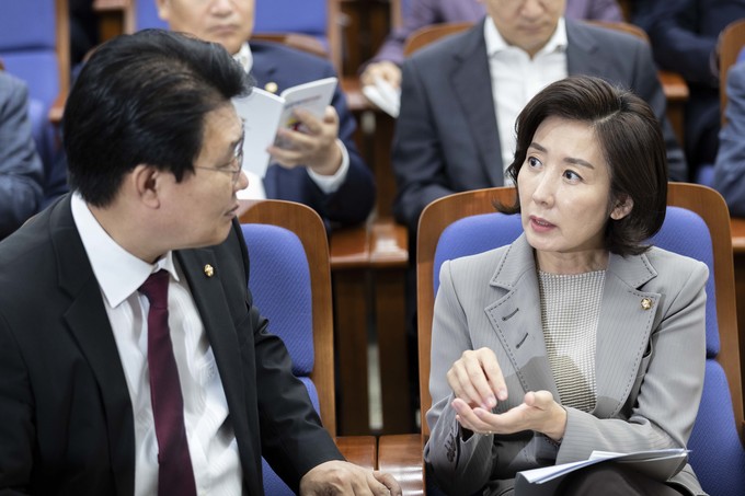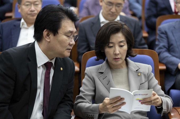 자유한국당 나경원 원내대표(오른쪽)와 정용기 정책부의장이 20일 오전 서울 여의도 국회에서 열린 '베네수엘라 리포트위원회 활동보고회'에 참석해 대화를 하고 있다.