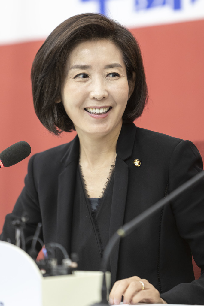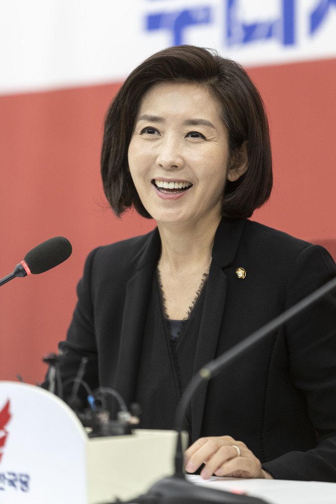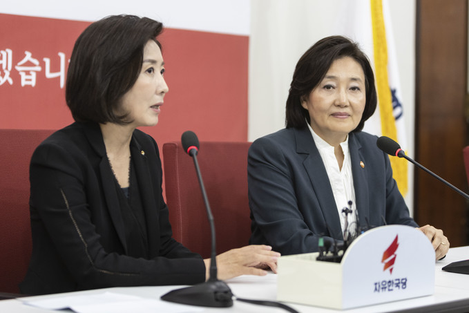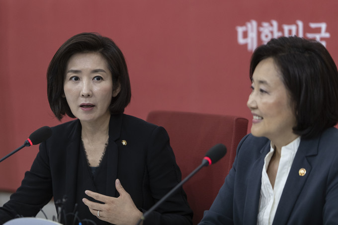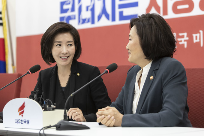 자유한국당 나경원 원내대표(왼쪽)가 1일 오전 서울 여의도 국회 자유한국당 원내대표실을 예방한 박영선 중소벤처기업부 장관과 인사를 나누고 있다.
