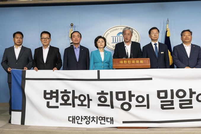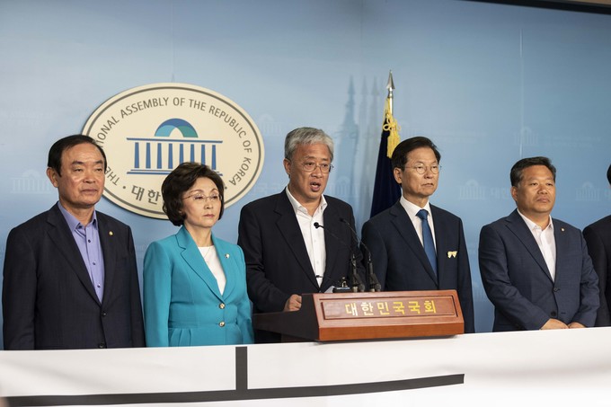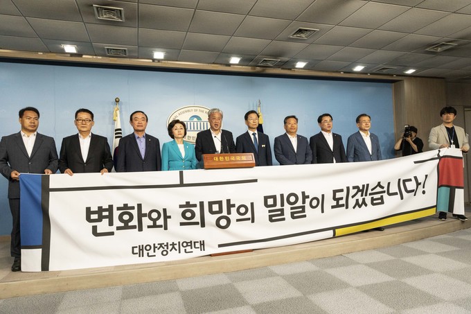 유성엽 민주평화당 원내대표를 비롯한 비당권파 모임인 변화와 희망의 대안정치연대(대안정치) 소속 의원들이 12일 오전 서울 여의도 국회 정론관에서 탈당 기자회견을 하고 있다. 왼쪽부터 이용주 의원, 박지원 의원, 장병완 의원, 장정숙 의원, 유성엽 원내대표, 천정배 의원, 김종회 의원, 최경환 의원, 윤영일 의원.